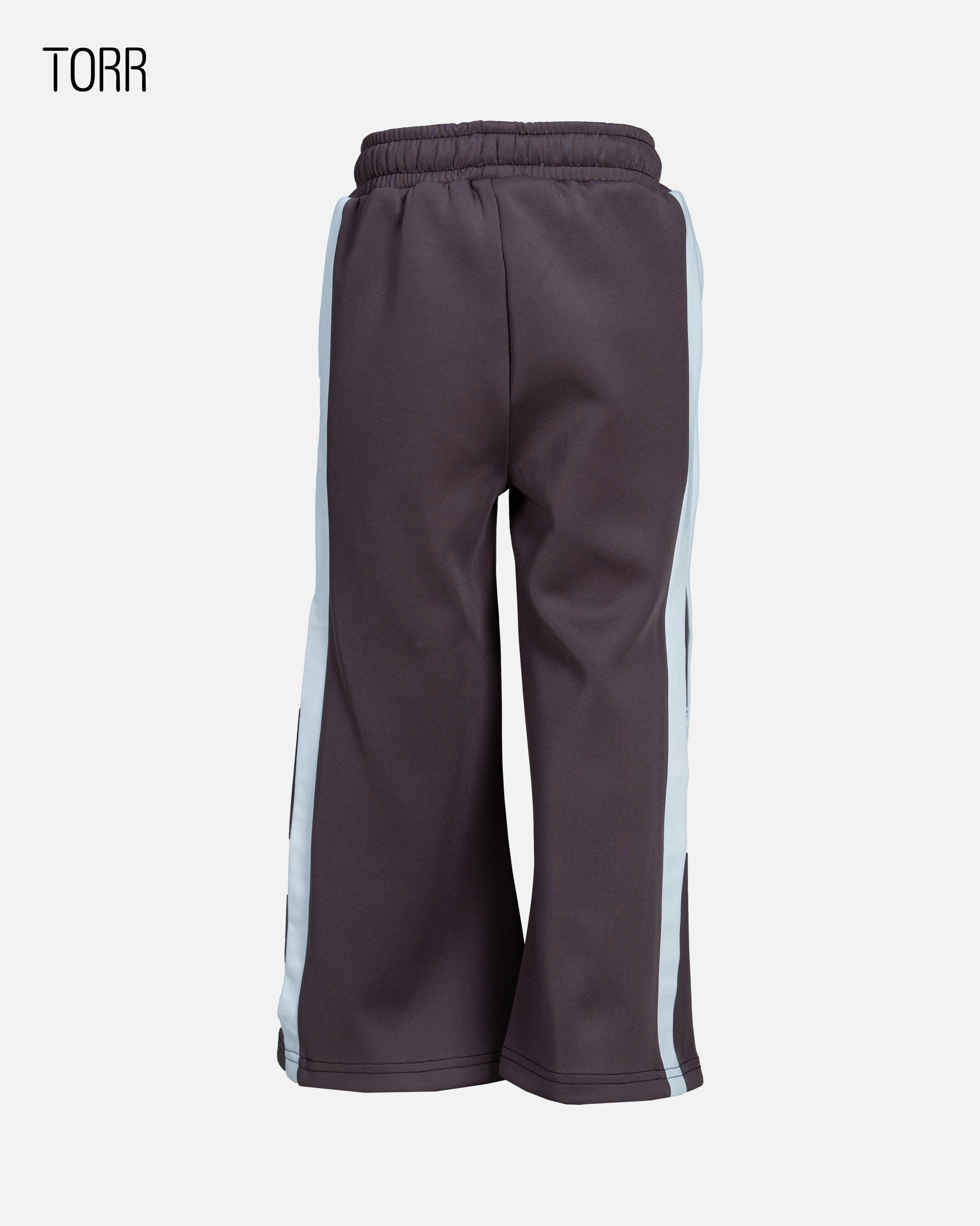 The Torr Girl's Trouser is a stylish and comfortable option for active girls. These trousers feature a modern, relaxed fit with a wide leg, offering ease of movement and a trendy silhouette. The main fabric is a deep charcoal gray, complemented by a contrasting light blue stripe running down the outer seam of each leg, adding a sporty and eye-catching detail. Designed with practicality in mind, they include an elasticated waistband with an adjustable light blue drawstring for a secure and customized fit, along with two side pockets for essentials. Made from 100% polyester, these trousers are built for durability and easy care, making them ideal for both casual wear and athletic activities.