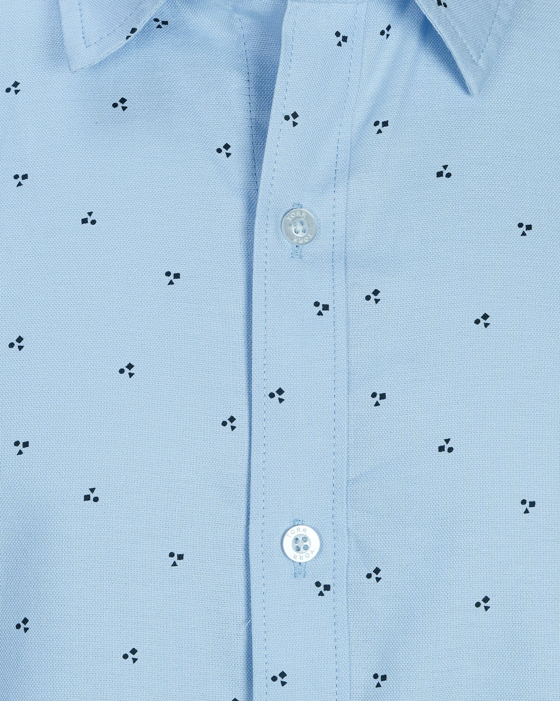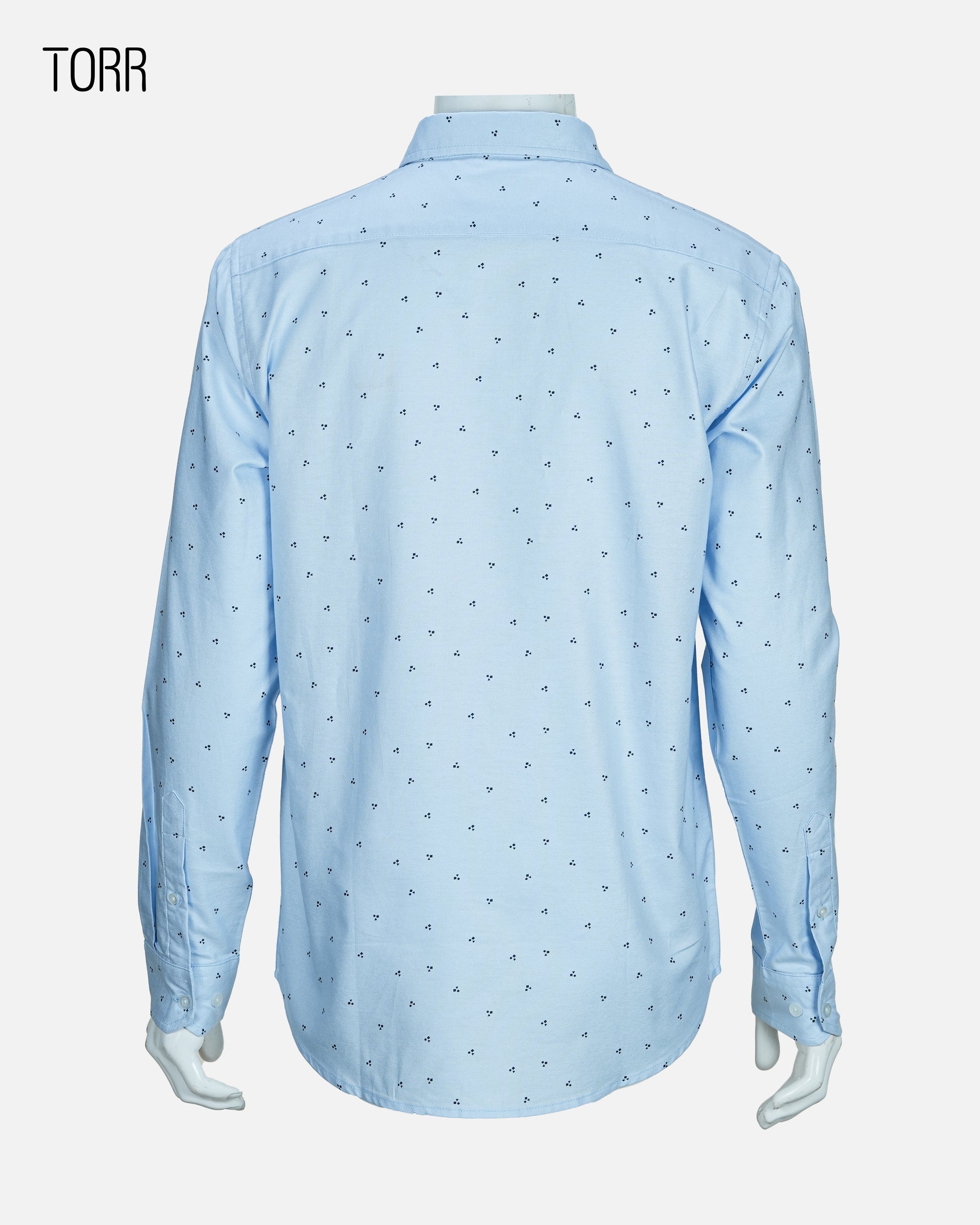 This is a stylish Torr Men's Long Sleeve Shirt made from 100% cotton, offering comfort and breathability. It features a light blue color with a subtle, repeating pattern of small dark triangles, adding a touch of modern sophistication. The shirt has a classic collar, a full-button front closure with white buttons, and long sleeves with buttoned cuffs. The overall design is versatile, suitable for both casual and semi-formal occasions.
