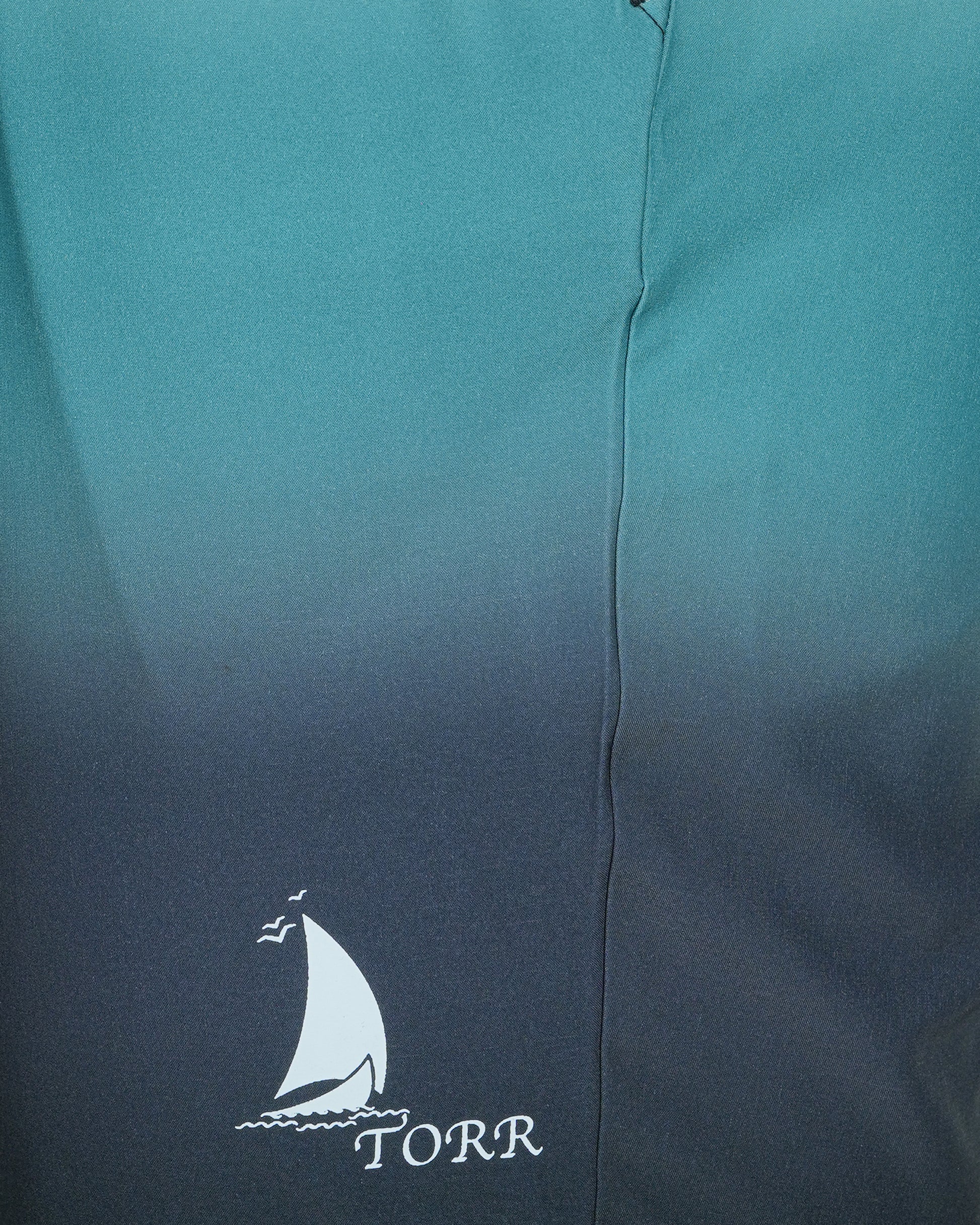 Dive into comfort and style with these ombre-effect swim shorts. Featuring a captivating gradient that transitions from a light, airy teal at the top to a deep, sophisticated navy at the hem, these shorts evoke the colors of the ocean. The design is clean and modern, with an elasticated waistband and an adjustable white drawstring for a secure and comfortable fit. A subtle logo is discreetly placed on the lower right leg.