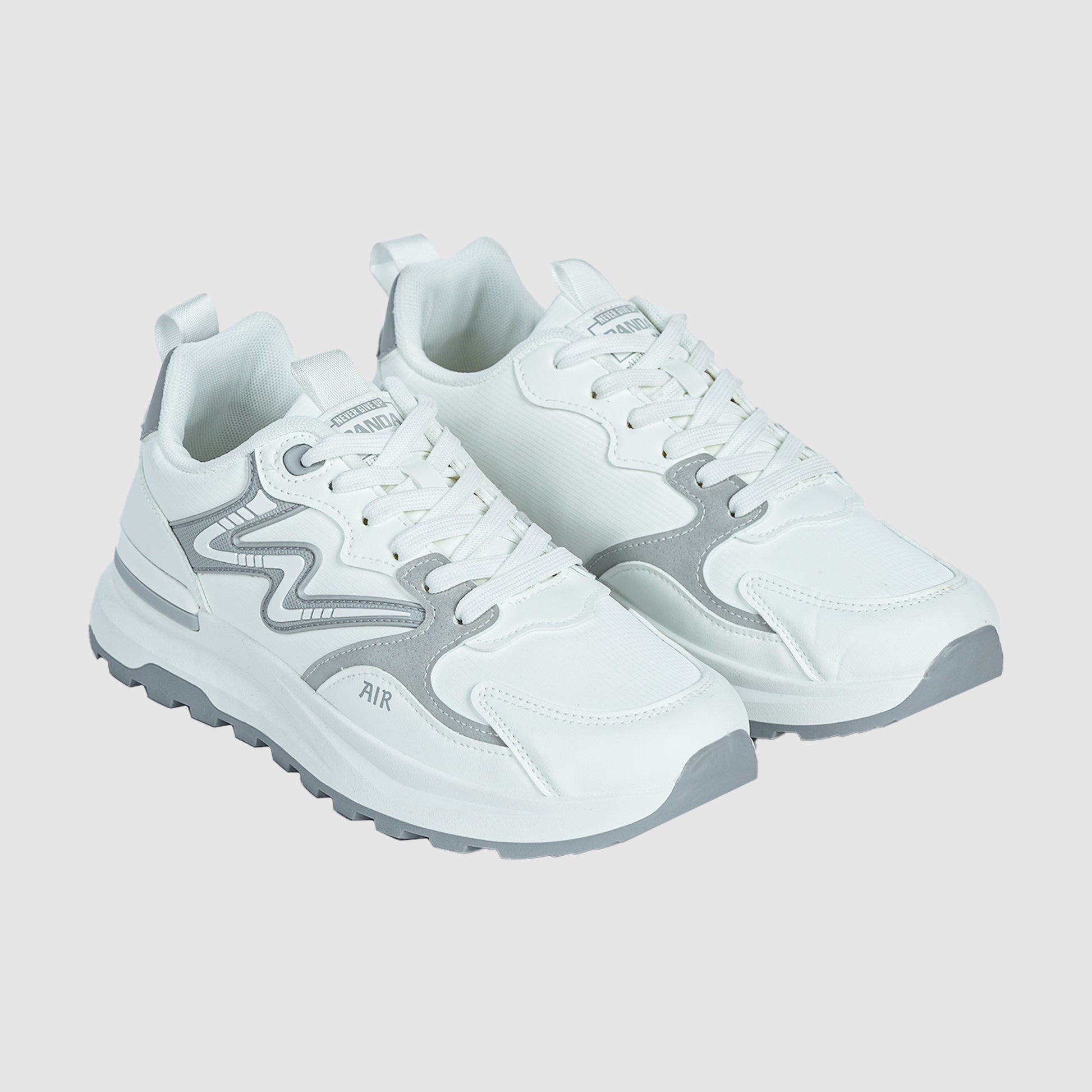These Panda Men's Sneakers feature a sleek and modern design, primarily in white with stylish grey accents. The upper appears to be constructed from a combination of materials, likely synthetic leather and mesh, to offer both durability and breathability. A prominent wavy grey design element is visible on the side, adding a dynamic touch to the aesthetic. The word "AIR" is subtly embossed on the side, suggesting potential air cushioning technology for enhanced comfort.