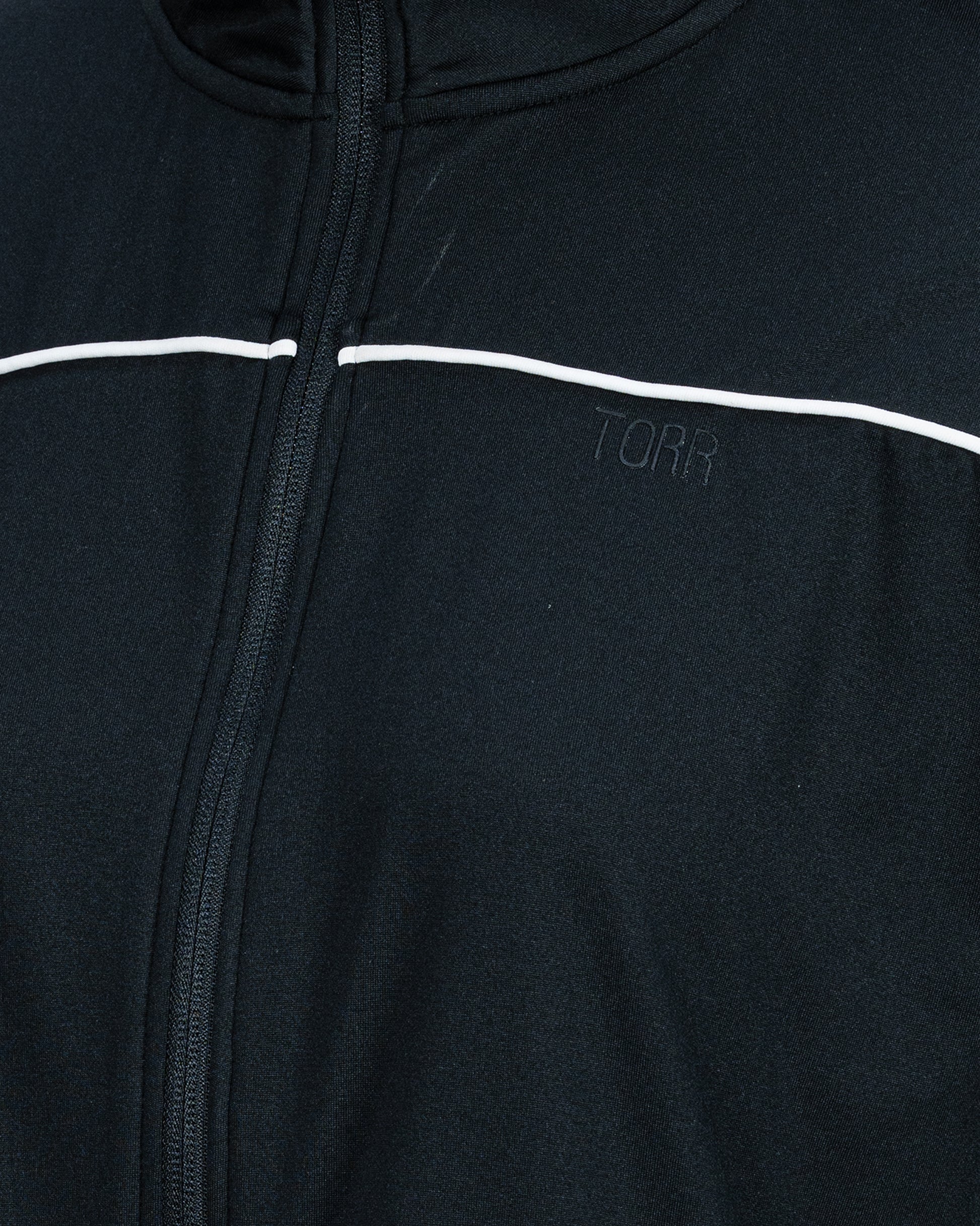 The Torr Women's Crop Jacket is a sleek and sporty full-zip jacket designed for both style and comfort. Crafted from a high-performance blend of 88% Polyester and 12% Elastane, this jacket offers a comfortable stretch fit that moves with you. It features a modern cropped length, a stand-up collar, and distinctive white piping details across the chest and down the sleeves, adding a touch of classic athletic flair. Perfect for layering over activewear or pairing with casual outfits, this versatile black jacket is an essential addition to any active wardrobe.