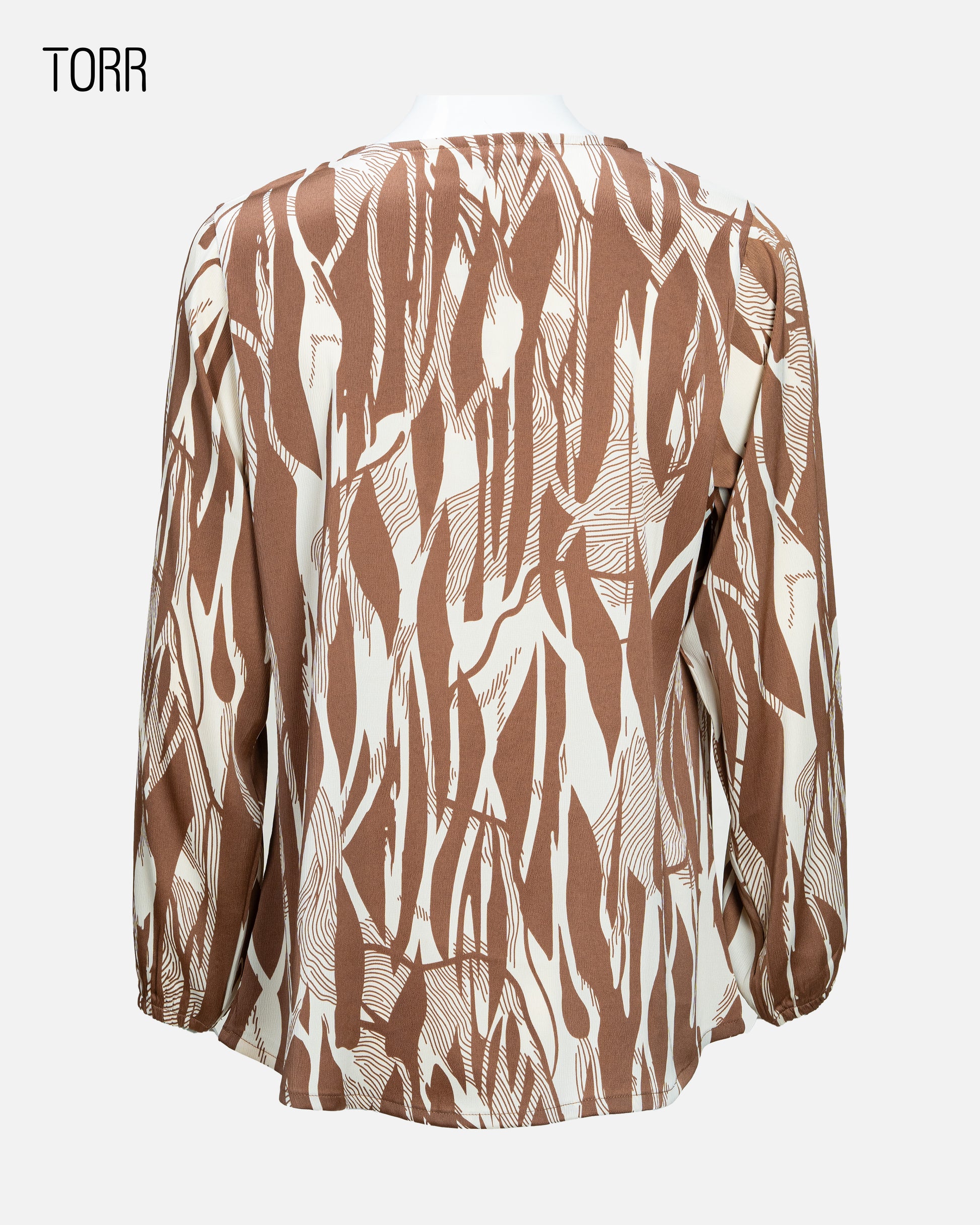 The TORR Women's Short Top is a stylish and versatile piece crafted from 100% polyester, offering a lightweight and comfortable feel. It features a striking abstract or animal-inspired print in shades of brown and off-white, creating a visually interesting texture. The top is designed with long sleeves and a V-neckline, adding a touch of sophistication. Its relaxed fit ensures ease of wear, making it suitable for various occasions, from casual outings to more dressed-up events.